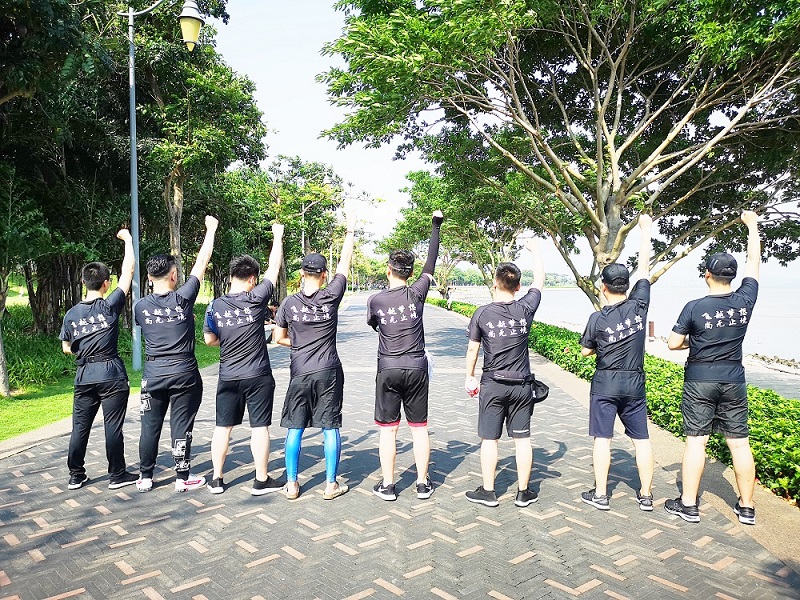 下午三时许,30余人从北湾鹭港出发,浩浩荡荡奔赴欢乐海岸。他们身着统一的装备,背后“飞越梦想、尚无止境”八个大字在阳光下熠熠生辉,胸前的和平鸽正迎风飞扬。