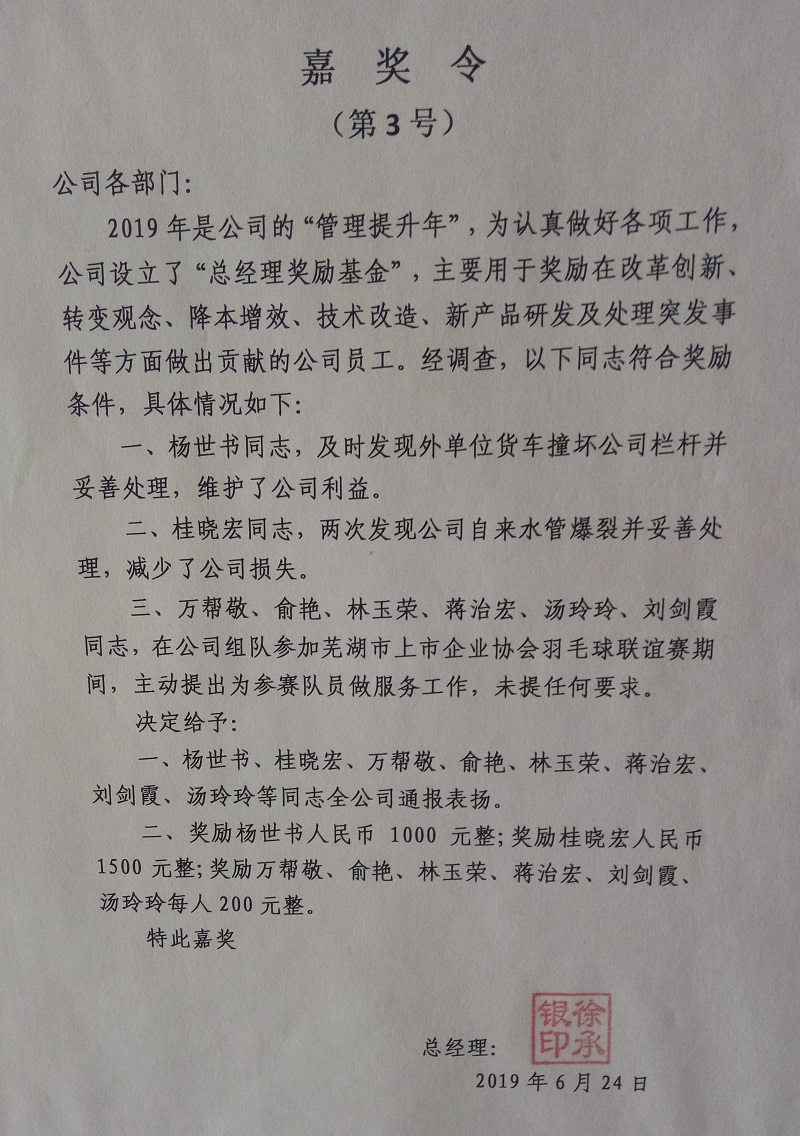 在2019年公司组队参加芜湖市上市企业协会羽毛球联谊赛期间,万帮敬等6名员工主动提出为参赛队员做服务工作;在日常管理中,桂晓宏两次发现厂区水管爆裂并妥善处理;在生产期间,李平及时反映了烘干机出料口部位上方屋面有部分横条弯曲断裂存在安全隐患等问题;在技术方案上,方吸云提交了《雷蒙磨运行中风量、分析机转速及物料特性之间相互影响的分析》……公司也及时对相关人员给予了几百元到几千元的奖励。